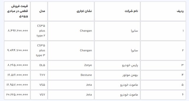 همچنین شایان ذکر است که قیمت‌ خودروها (قطعی و علی‌الحساب)، در مبادی ورودی بوده و هزینه‌ها و عوارض قانونی معمولِ پس از ترخیص،  در هنگام صدور فاکتور نهایی به قیمت‌ قطعی که مصوب خواهد شد، اضافه خواهد شد.